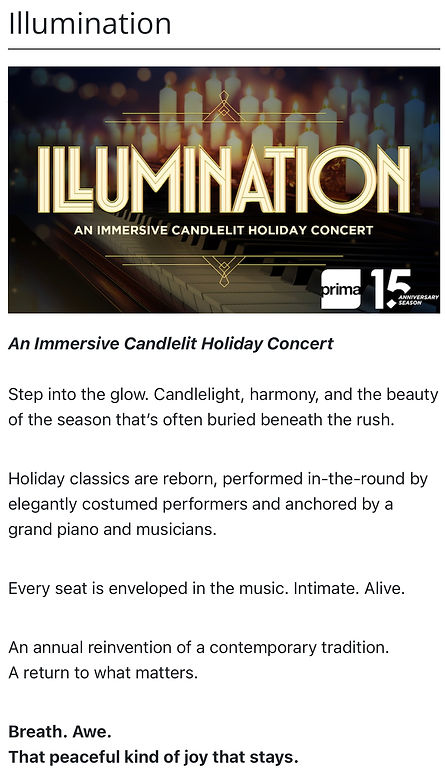 Joshua will be returning as a vocalist in this community favorite, Illumination at Prima Theatre!